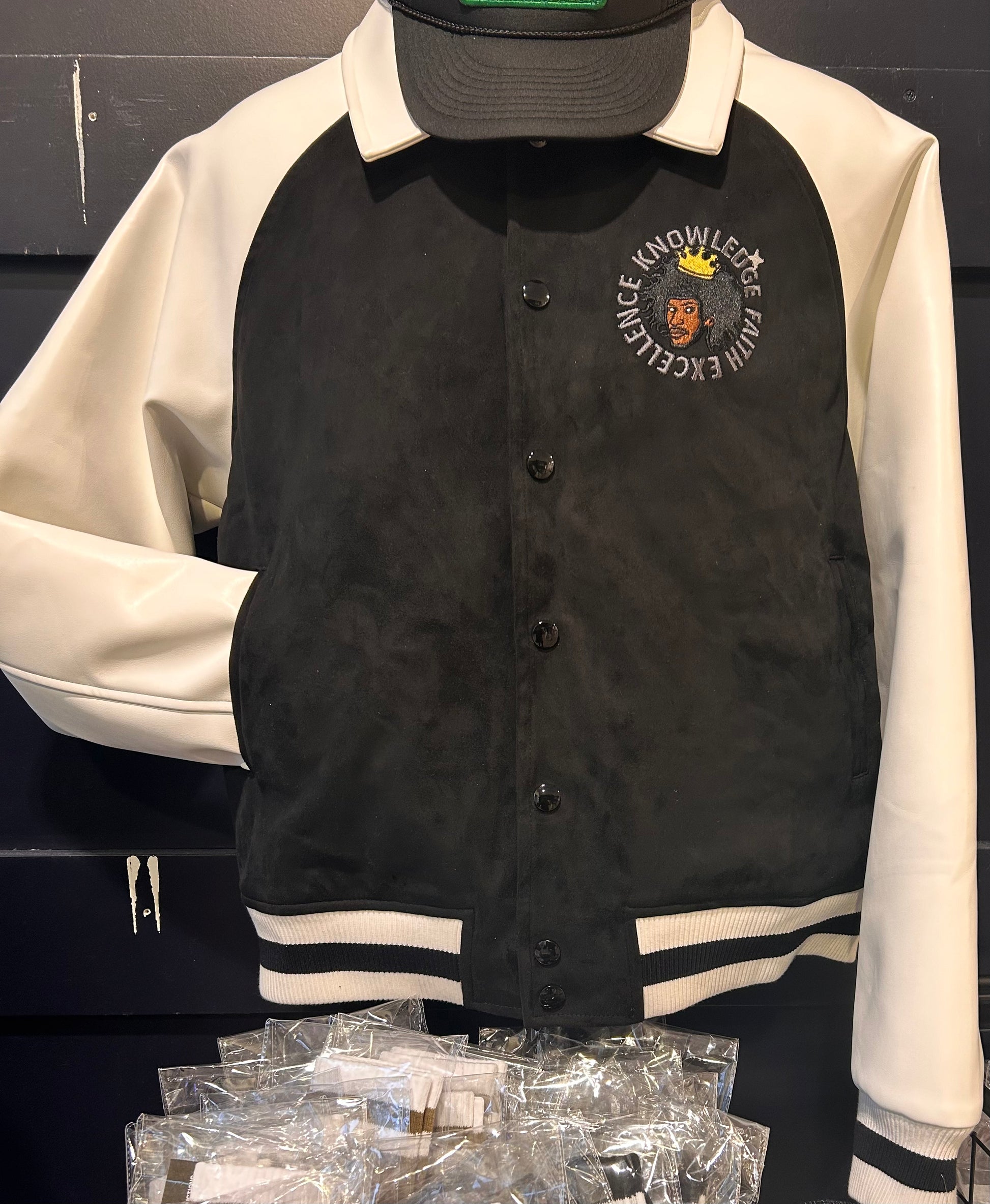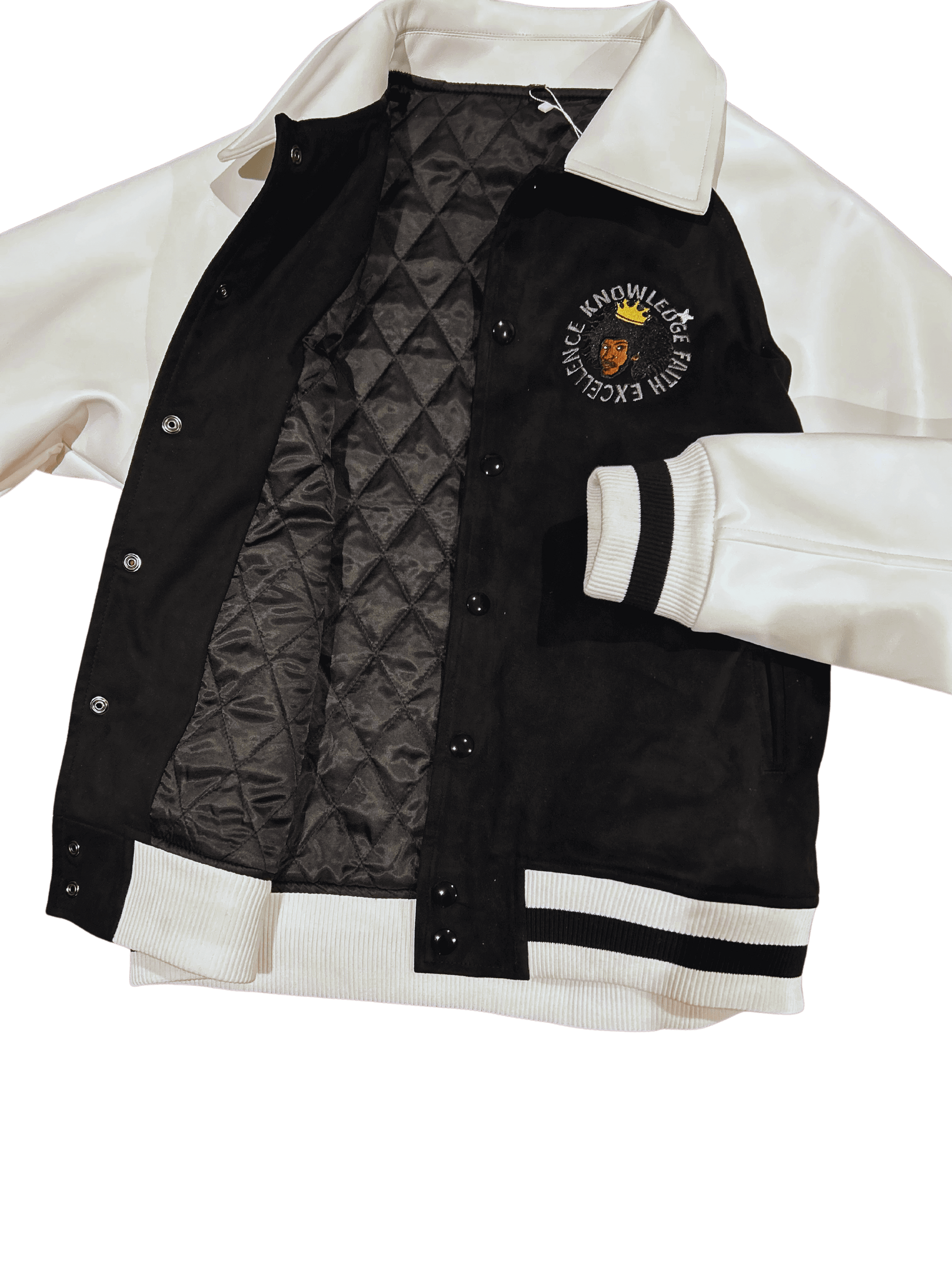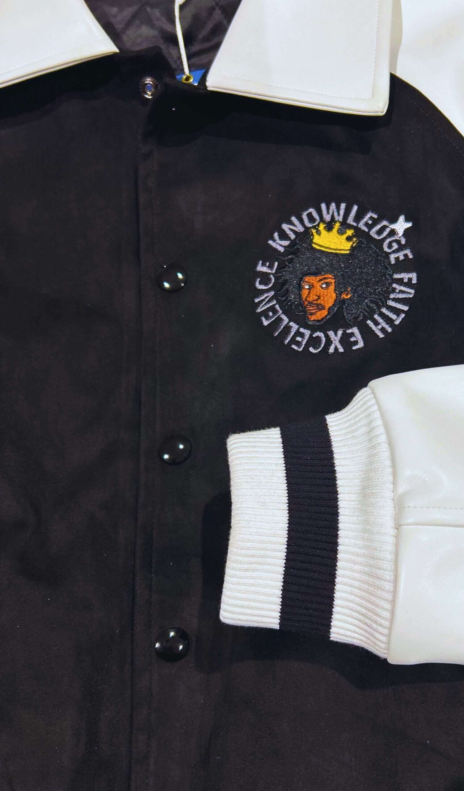 Step into empowerment with our exclusive Black and White Varsity Jacket, featuring PU Leather Sleeves and Collar, along with Vegan Black Suede. The upper chest proudly showcases a Black Excellence Design centered around Faith, Knowledge, and Excellence, symbolizing the strength and resilience of the Black and Brown community.