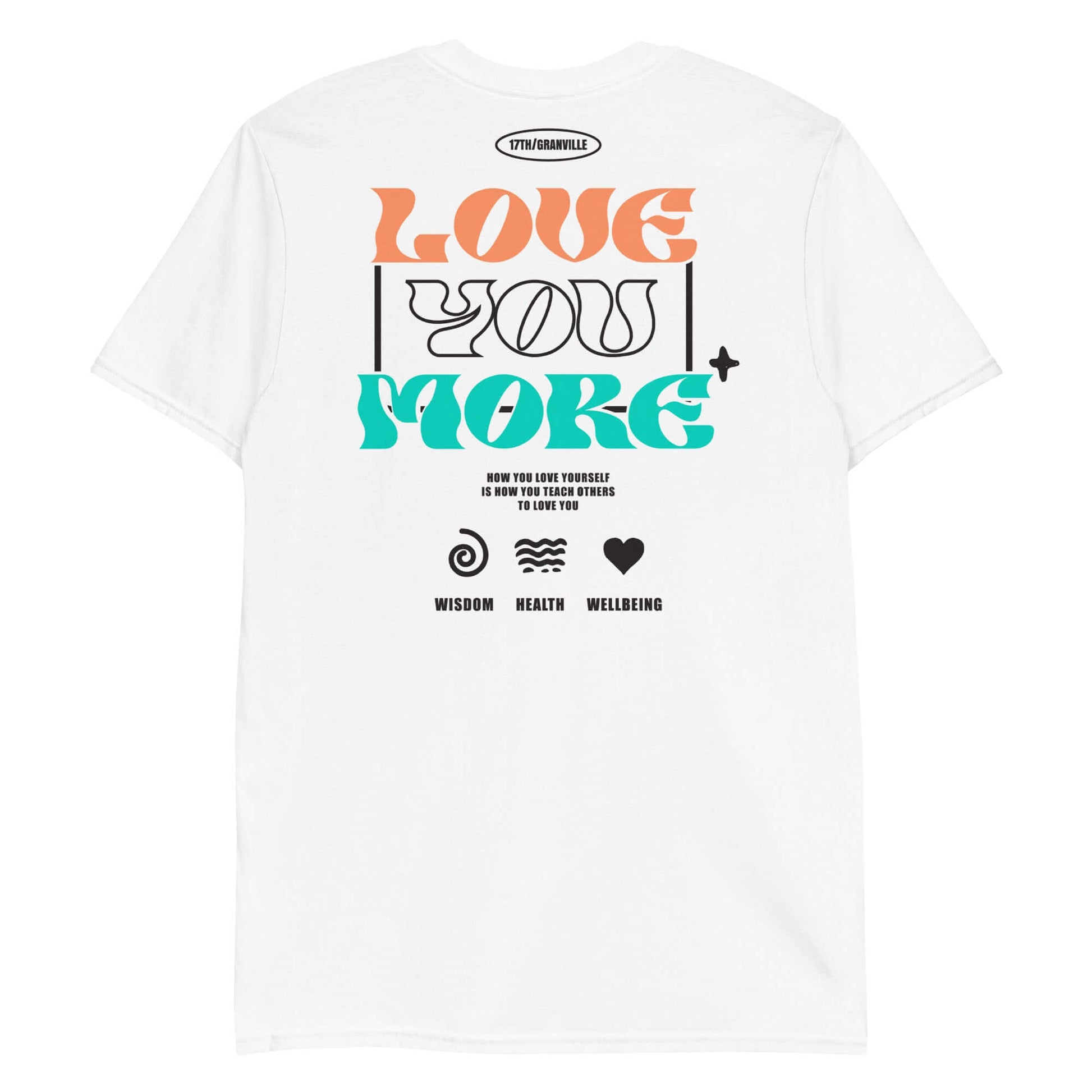 The Love You More: Summer Edition t-shirt features a vibrant orange and teal emblem on the front with an empowering graphic on the back. This design was created to inspire self love and reflect on wisdom, health and well being.